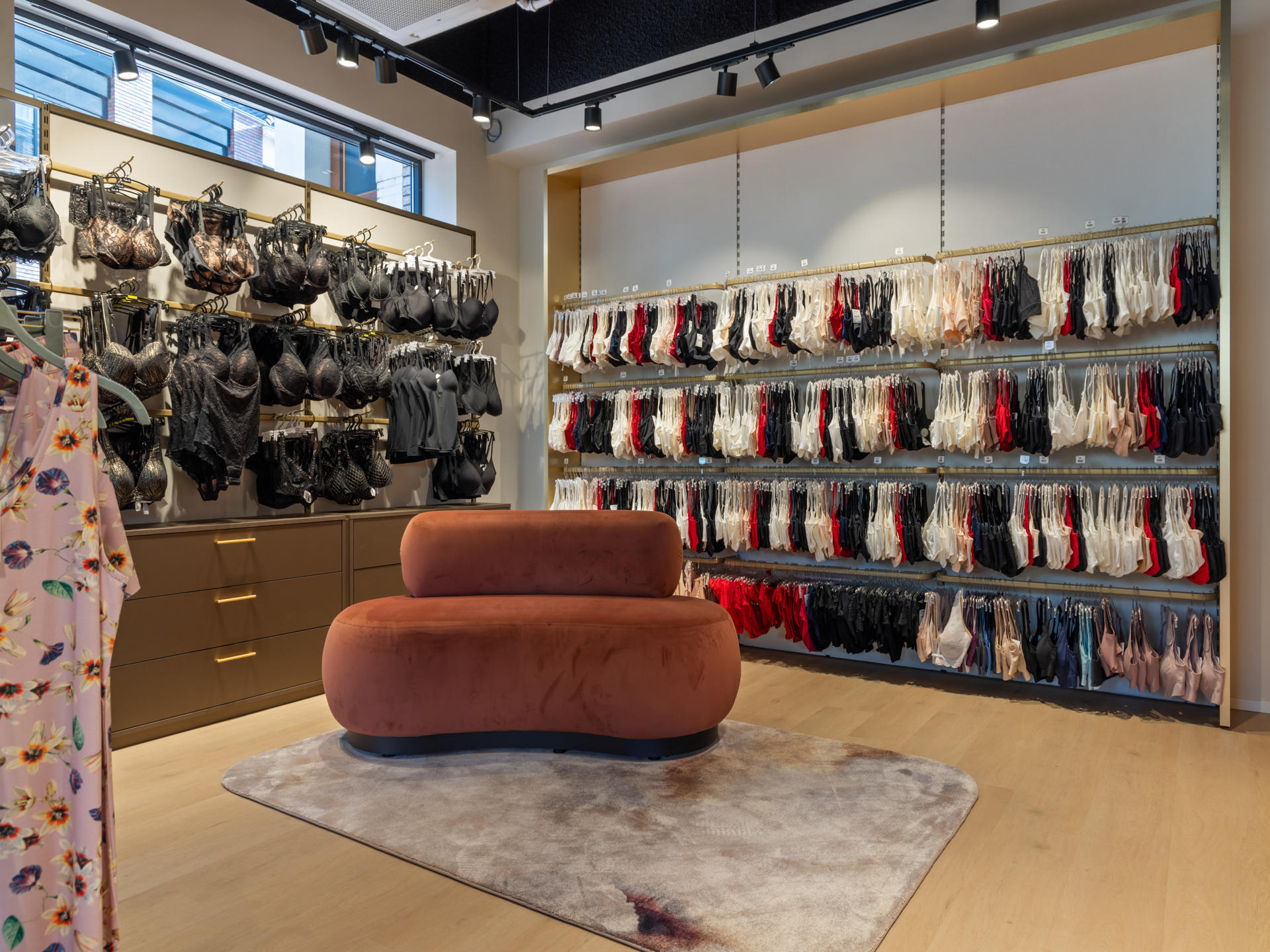 Beim Betreten fällt sofort die helle und offene Atmosphäre des Geschäfts auf. Durch die großen Fenster strömt viel Tageslicht hinein, was dem Interieur eine frische Ausstrahlung verleiht. Die Lingerie ist übersichtlich und luftig präsentiert, sodass Kundinnen schnell und unkompliziert finden, was sie suchen. Die Einrichtung ist praktisch gestaltet und vermittelt zugleich Qualität, genau so, wie man es von einer modernen Retail-Umgebung erwartet.