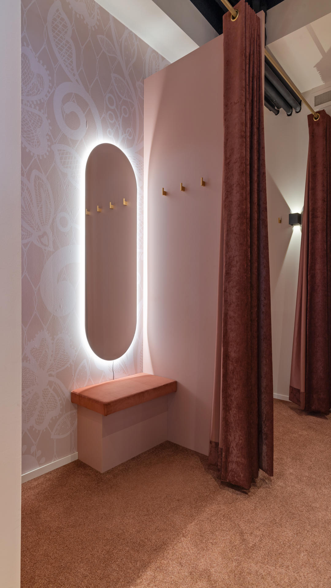 Die Umkleidekabinen sind großzügig und komfortabel gestaltet. Es wurde bewusst eine ruhige Anordnung mit ausreichend Privatsphäre gewählt, damit Kundinnen sich in aller Ruhe umziehen können. Die Gestaltung fügt sich nahtlos in das übrige Interieur ein und trägt zu einem stimmigen Einkaufserlebnis bei. Die Inhaber, Pleun und Sjoerd, haben sich ganz bewusst für dieses Konzept entschieden: praktisch, gepflegt und kundenorientiert, genau so, wie sie sich ihr Geschäft vorgestellt haben.