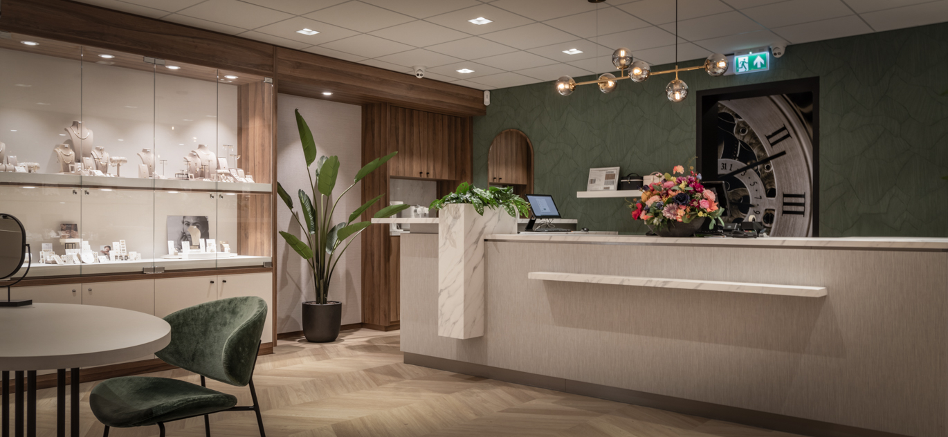 Nach der Übernahme des Geschäfts seiner Eltern im Jahr 2020 entschied Mitchel sich 2023, WSB Design für eine komplette Renovierung und ein neues, luxuriöses Ladeninterieur hinzuzuziehen. Der gesamte Laden wurde entkernt und alles wurde erneuert: Fassade, Decke, Elektroinstallation, Beleuchtung, Boden und maßgefertigte Möbel, einschließlich maßgeschneiderter Vitrinen aus Nussbaumholz. Durch diesen rigorosen Ansatz konnte die Ladenfläche erheblich vergrößert werden, indem die Fassade nach vorne gezogen wurde.