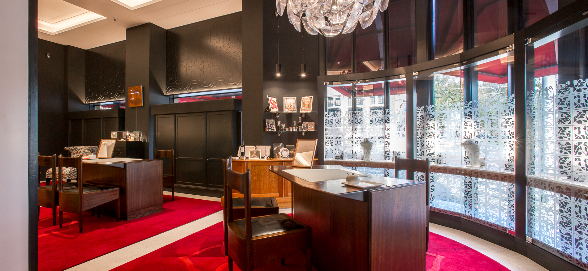 Für Juwelier Steltman in Den Haag haben die Innenhausarchitekten von WSBDESIGN.COM eine eingreifende Renovierung durchgeführt, bei der architektonische Höhepunkte aus der niederländischen Geschichte respektvoll erhalten wurden. Wenn Sie gut schauen, sehen Sie, wie die Geschichte in einer Reihe von Elementen in der Innenausstattung des Mittelbereichs beibehalten wurde.